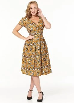 This beauty is made of a beautiful quality cotton-mix with a slight stretch and a satin finish, making those colours shimmer your way. The waist is accentuated with the seam, down from which she flares out into a full skirt through narrow pleats. She’s perfect for combining with one of our petticoats for that festive look! With a height of 1,70 she reaches down to the knee and closes with a zipper on the back.