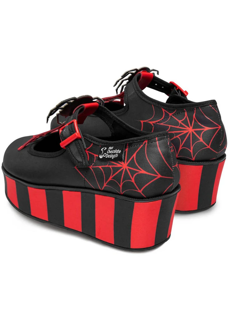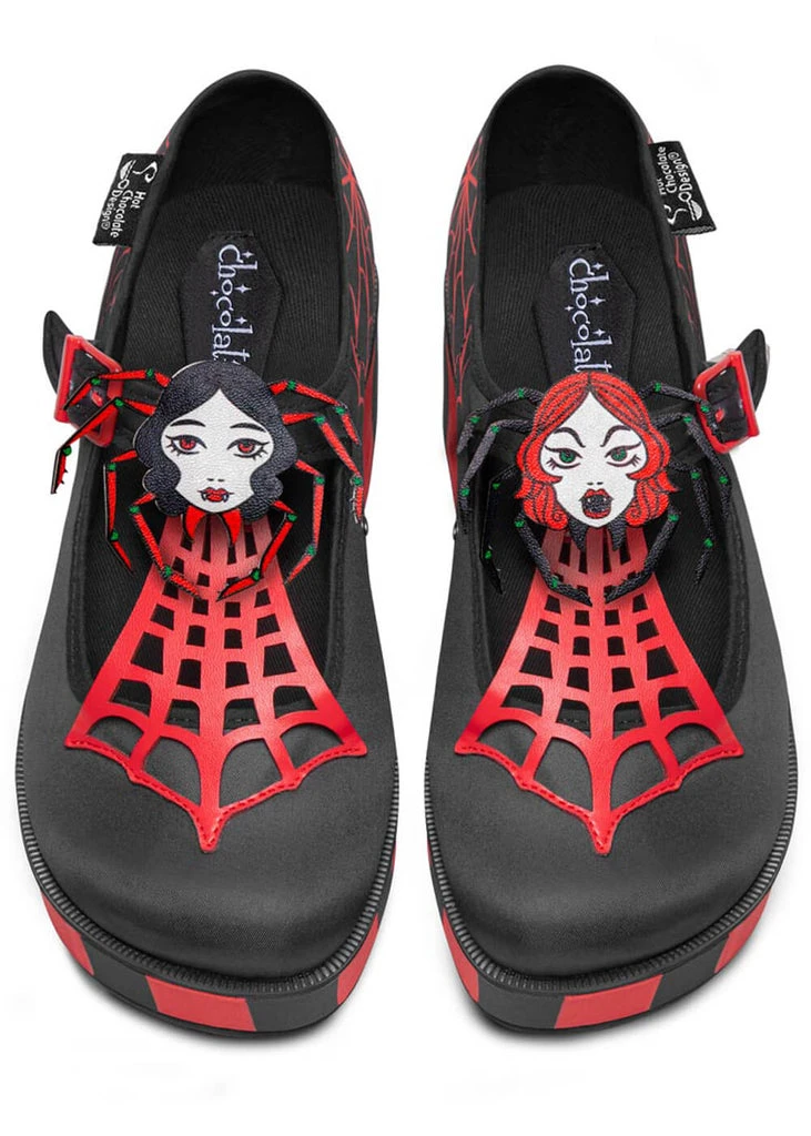 Get tangled in the web of Spindora, who spun it over your foot! The ladies themselves are sitting above their work, kept in place by removable clips over the adjustable t-strap. The textile coated vegan-leather has a joyful gloss and of course a spiderweb-print.